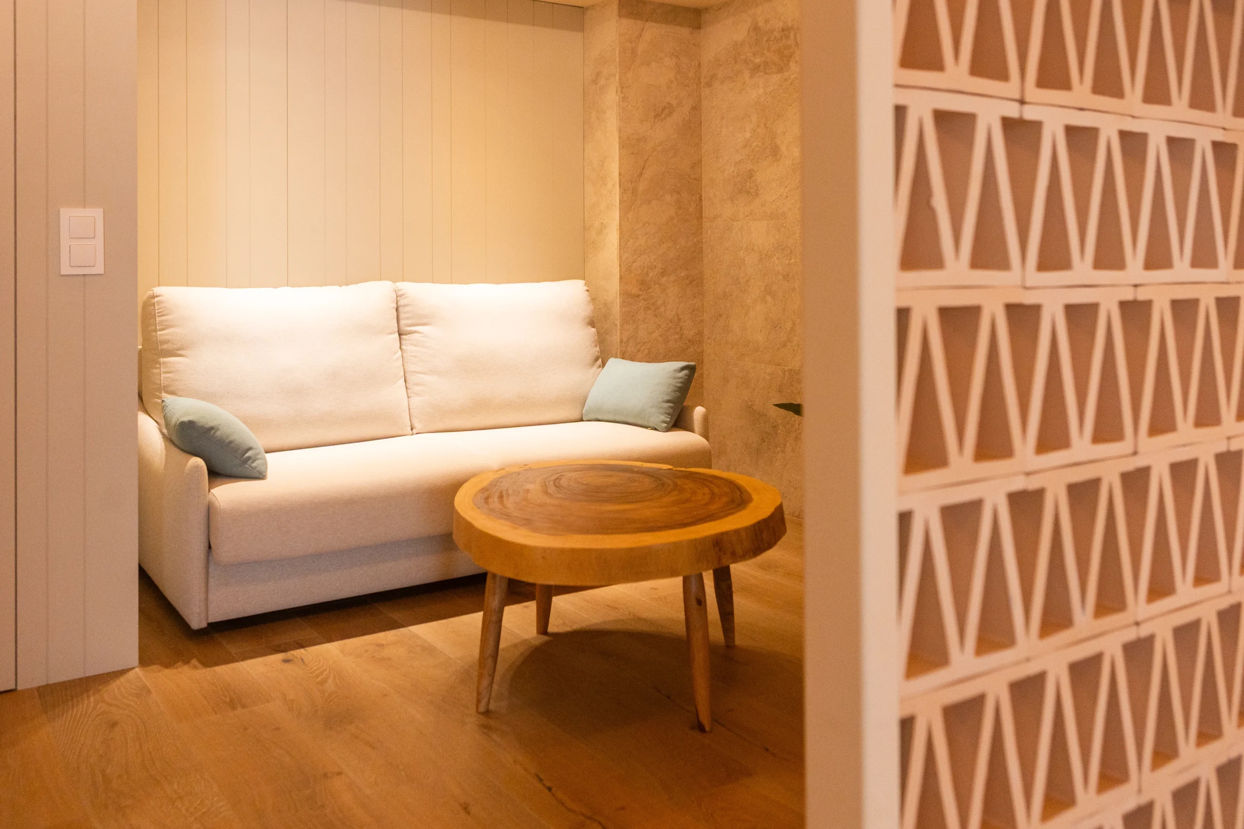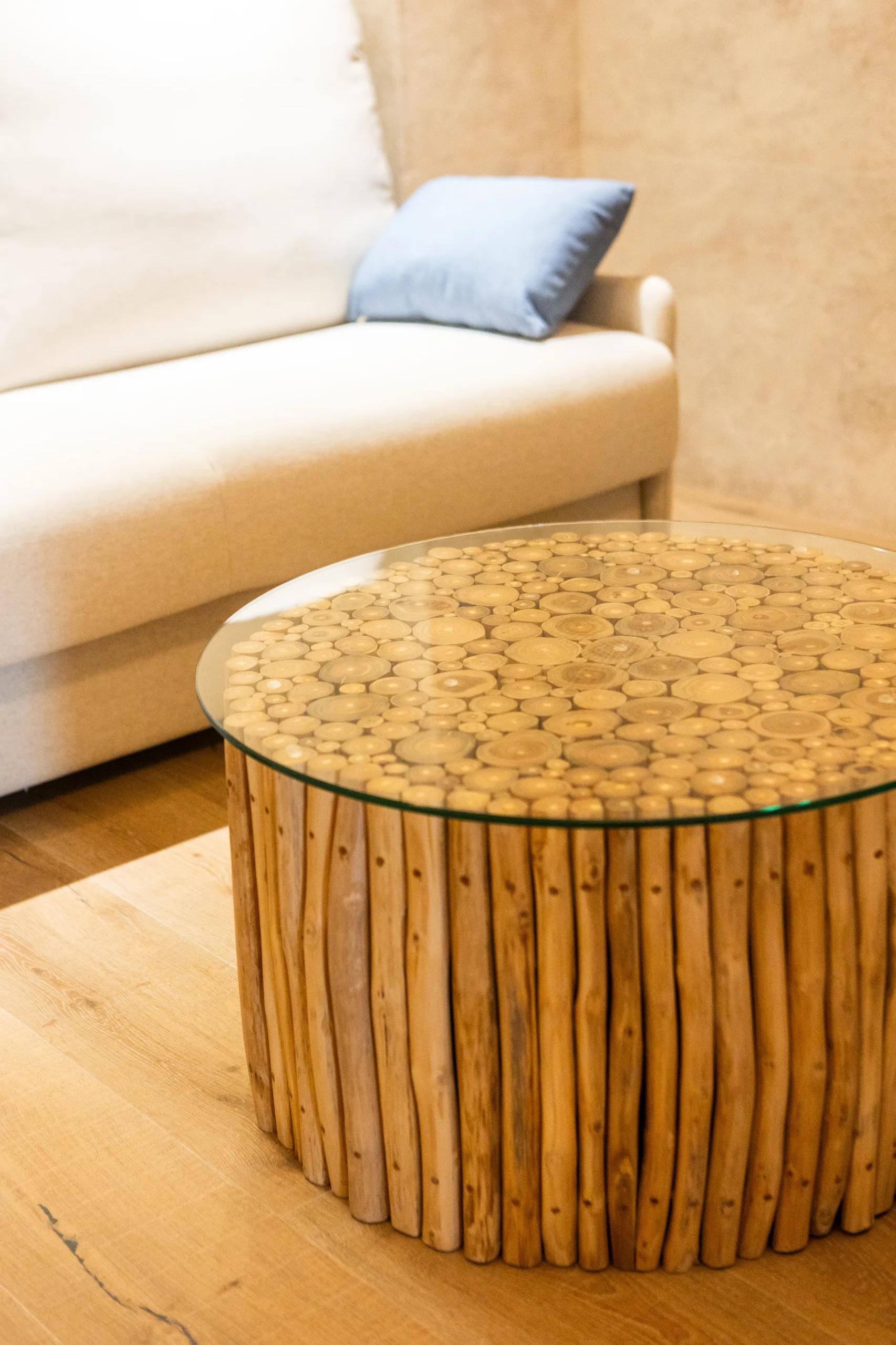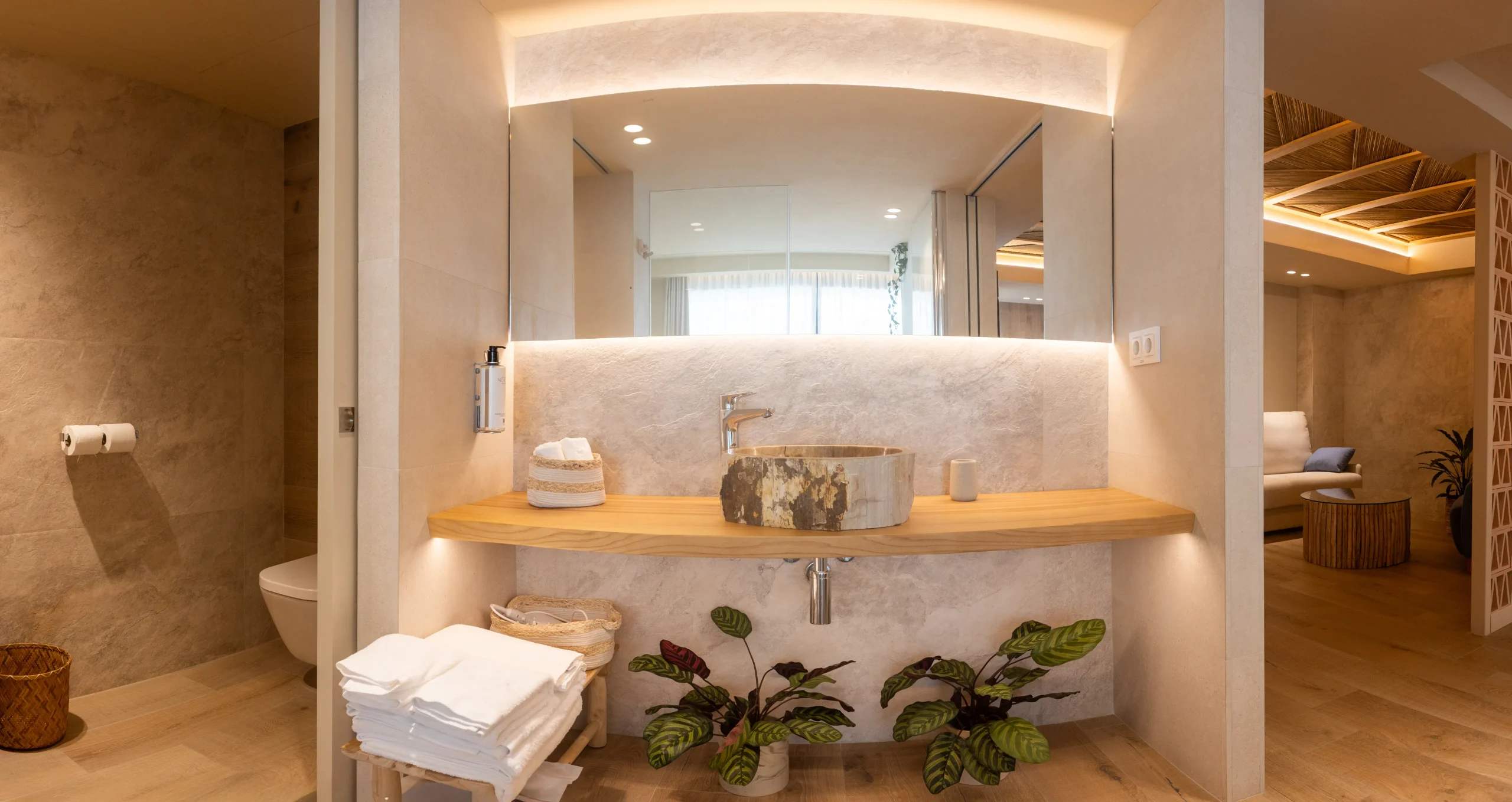 Son las Suites más grandes con 42m2 y 2 estancias, perfectas para recrearse en pareja o familia, constan de una amplia habitación matrimonial y un salón con sofá cama de estilo italiano y sillón. Tienen un baño privado de ensueño con ducha y bañera, lavabo de piedra natural tallada a mano y mobiliario de diseño exclusivo. Su inmensidad y belleza te atrapan a no querer salir de ellas. Al caer la noche, la aterciopelada iluminación crea un mágico ambiente de sensaciones maravillosas.
