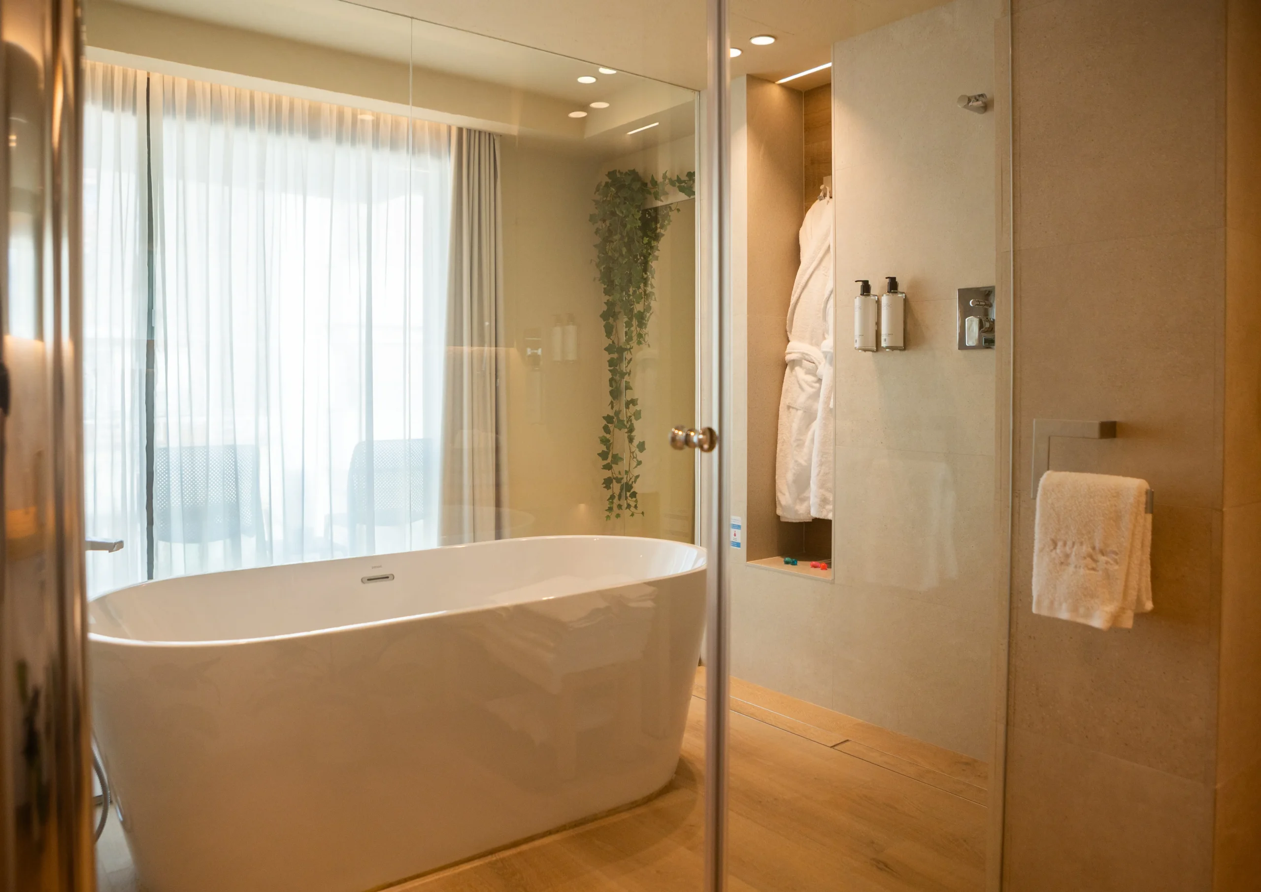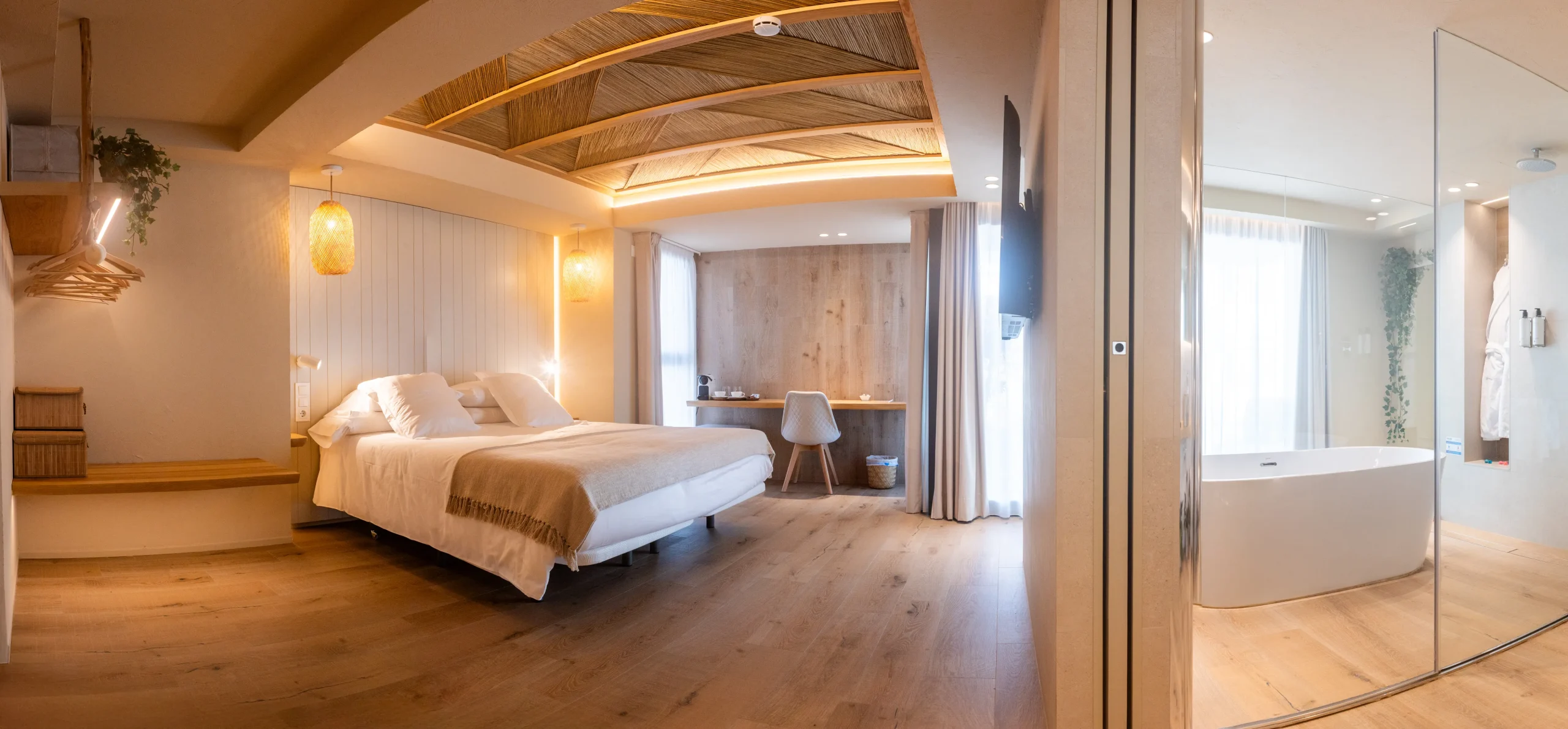 Con terraza privada de 22m2 y cama King Size de 200 x 200. Bañera con vistas al mar.